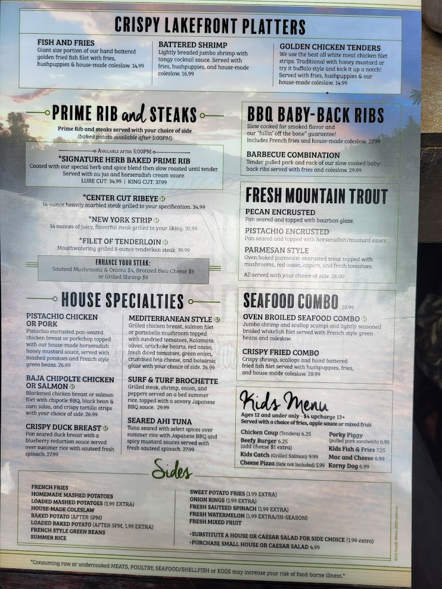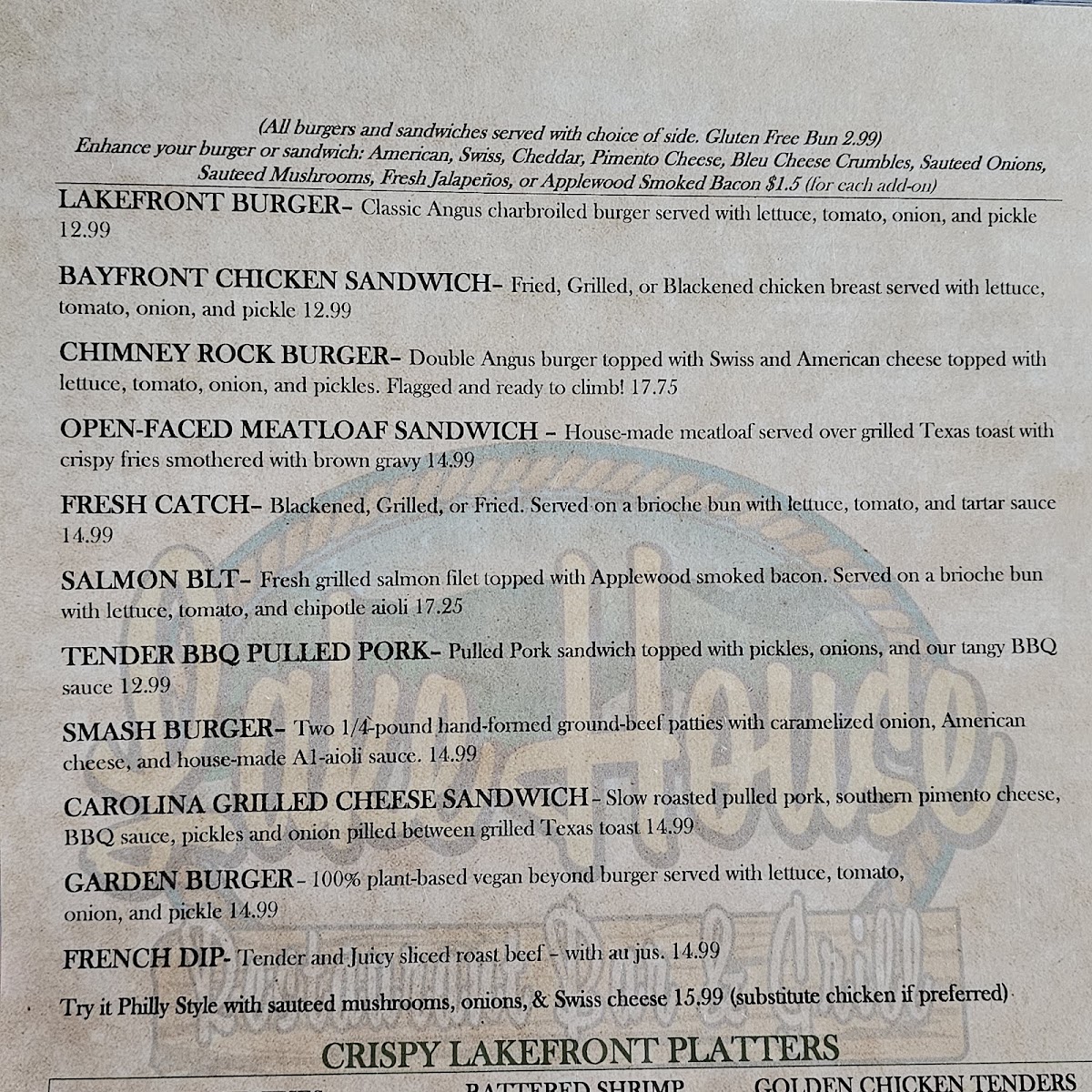 The drink selection pairs well with the laid-back atmosphere—with signature cocktails like the Bloody Mary and a range of specialty and draft beers to enjoy while taking in views of the lake. Sweet tea and other traditional beverages add to the sense of ease and familiarity, making it a welcoming spot for sharing simple, satisfying moments.